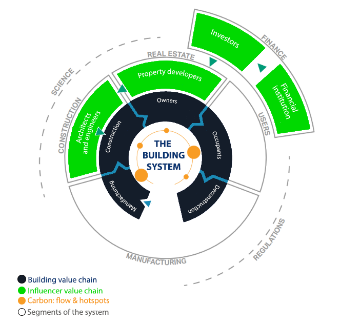 This means that a company needs to collaborate tightly with businesses in its ecosystem, in order to accurately estimate its carbon print, to be fully compliant and to know where to optimize. In the case of Construction and Banking, The Building System Carbon Framework document published by WBCSD (see document and source pictures here: https://www.wbcsd.org/Programs/Cities-and-Mobility/Sustainable-Cities/Transforming-the- Built-Environment/Decarbonization/Resources/The-Building-System-Carbon-Framework ) clearly illustrates the extended structure of the shared ecosystem, when looking at all participants in the value chain of the Constructions economical area: